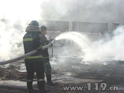消防官兵到达出事地点时,看到一辆车牌号为冀BF26XX的拖挂汽车已被大火跟浓烟包围,火势正处于猛烈燃烧阶段。据车主介绍,车上装有大量的草帘。此时大火已经将拖挂车上的大部分草帘引燃,火势非常猛烈,若火势蔓延至油箱,汽车极有可能发生爆炸。此外,汽车停放的位置紧邻铁路,火势一旦蔓延,后果十分严重。为了顺利有效的控制火灾,最大限度减少损失、防止意外发生。消防指挥员迅速下令,先用水炮压制,防止火苗乱窜,引燃附近的树木。5分钟后,火势基本得到控制。指挥员又下令出一支水枪对草帘做进一步的扑灭。