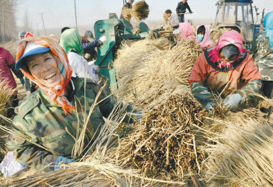 11月20日,在河南省新乡市原阳县辽中县六间房镇马龙村的稻田地里,农户们利用冬闲加工大棚草帘子,每亩稻草可多收入200元左右。