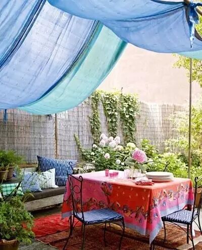怕晒的话,可以用这种搭建天棚的方式。配上彩色的布艺和绚丽的地毯,营造艳丽的东南亚风情。