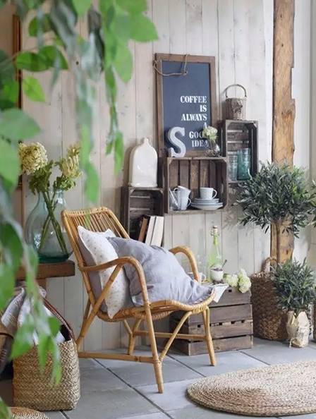 藤椅、草垫、芦苇编的包包还有蒲团,加上点缀的绿植,扑面而来的就是浓浓的田园风。