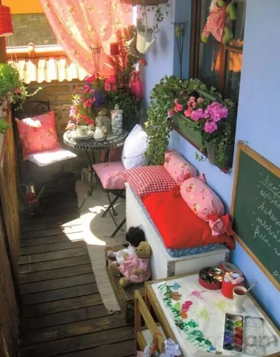 想要有一个芭比公主风格的阳台其实也很容易。粉色花朵的布艺靠垫,加上各色娃娃,再摆上宝宝最爱的画板,就能和孩子一起玩整个下午。