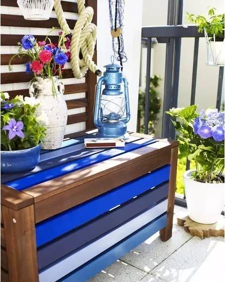 阳台的色彩不在于多,而在于有“亮点”。试着给花架刷上亮色的漆,设计这事儿没有出彩只有更出彩。