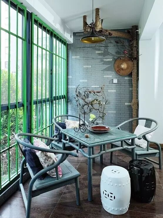 中式风格布置到阳台上也很不错。想象一下,一家人围坐在桌边,就着窗外绿意,聊天喝茶是怎样的其乐融融。