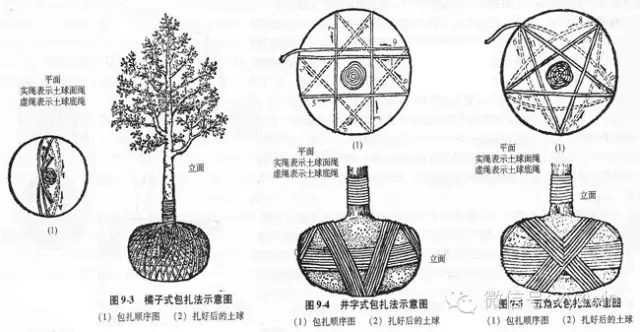 这样有利草绳绕过底沿不易松脱。然后用蒲包、草缝等材料包装。壤土和砂性土均应用蒲包或塑料布先把土球盖严,并用细绳稍加捆拢,再用草绳包扎;黏性土可直接用草绳包扎。草绳包扎方式有3种: